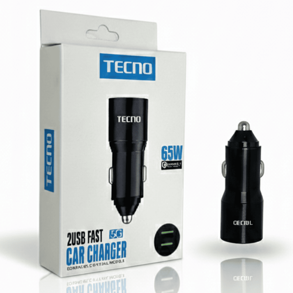 Potencia extrema en tu vehículo. Cargador Tecno de 65W con doble puerto USB, diseñado para una carga ultra rápida, segura y eficiente de tus dispositivos móviles.
